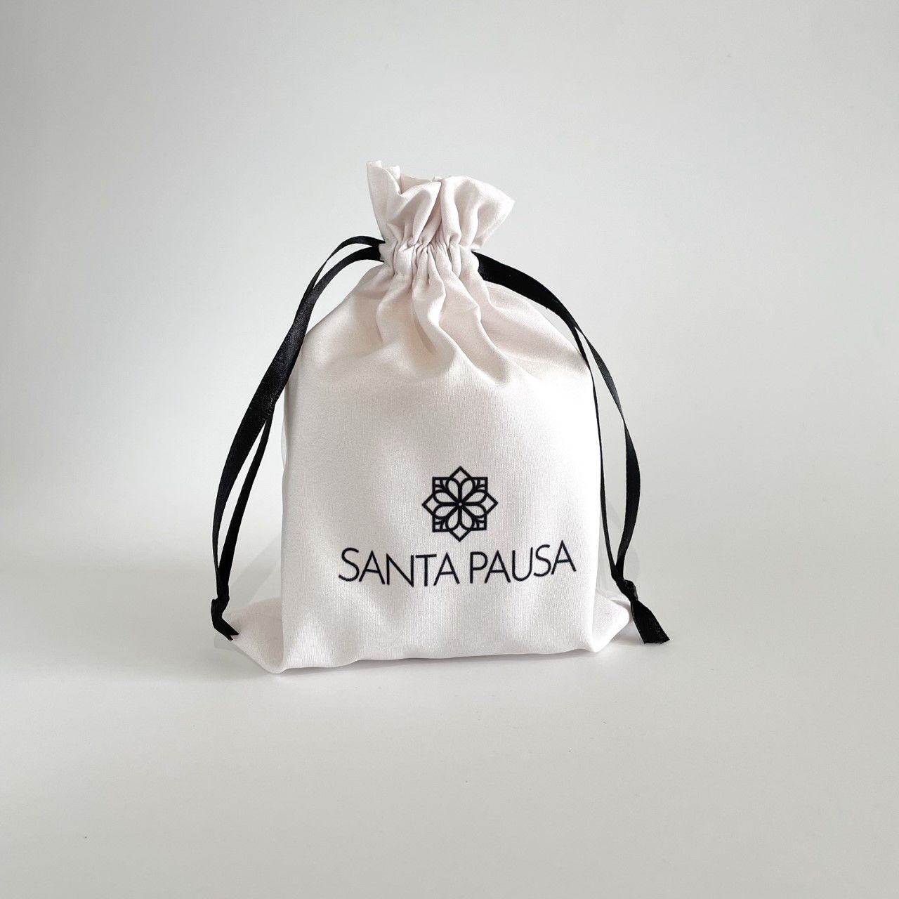 Saquinho de microfibra de borda dupla e acabamento em fita de cetim preta.